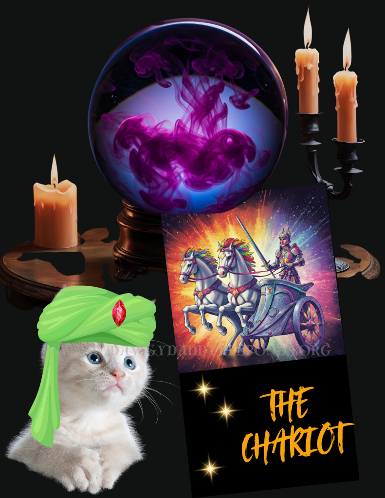 You have misunderstood the situation and have untangled the wrong ball of twine. The Chariot implies impulsiveness and lack of concentration. Your impatience has gotten the better of you, and the kitty catnap will not go your way. You must learn to think on your feet so that you can catch the mouse. Leave yourself a better future by clawing the post instead of the couch, go with your curious catnip intuition.