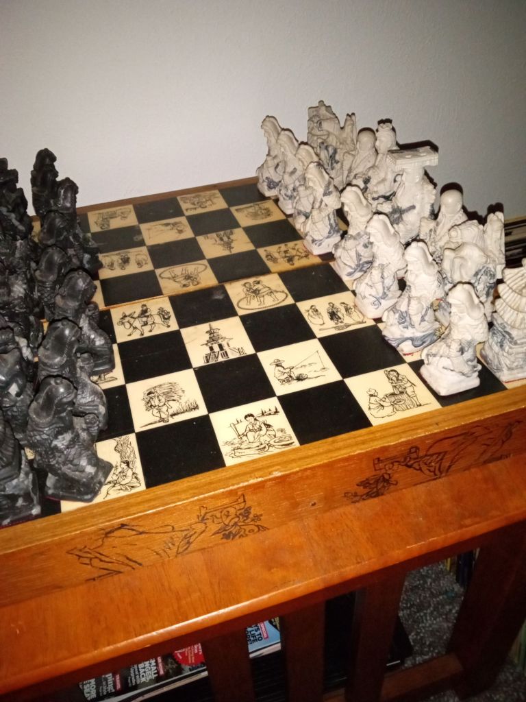 This beautiful set is hand carved from soapstone and the board is the carrying case, it folds up. /the detail is amazing. The funny thing about this chess set is that no one in my family was ever into playing chess but me. This had sat in closets or attics for the best part of forty years before I gladly set it out to use.