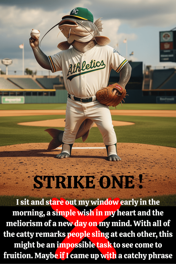 As the scent of Starbucks fills the air a simple wish today is that meliorism will be a catchy new trend to replace the catty attitude that people live with on a daily basis. As a sip of caffeine concoction is taken, I look out the window and remanence of the time when a famous baseball pitcher had the catchy name of Catfish Hunter given to him by the owner of the Kansas City Athletics before being traded to the Oakland A’s.