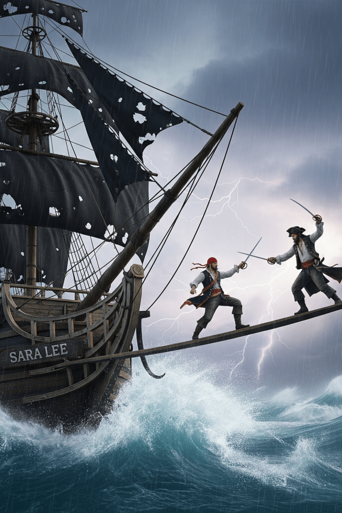 Ol’ Kona Bob wanted nothing more than to be the captain of the majestic Sara Lee, a beautiful art of work. To qualify for the title Kona Bob would anon endure a fight to the death while standing on the plank. Curly Joe would be his opponent and Ol’ Kona Bob was sure he would make Curly Joe surrender as his part of the plank continued to shrink.