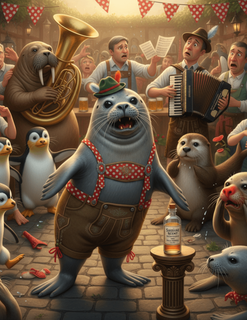 A polka dancing seal started to growl when the crowd began to divaricate in a haphazard manner causing confusion among the band. After finding out that a sea lion was allergic to the smell of the sardine cologne he was wearing he settled down and began dancing again having fun in earnest. [52]