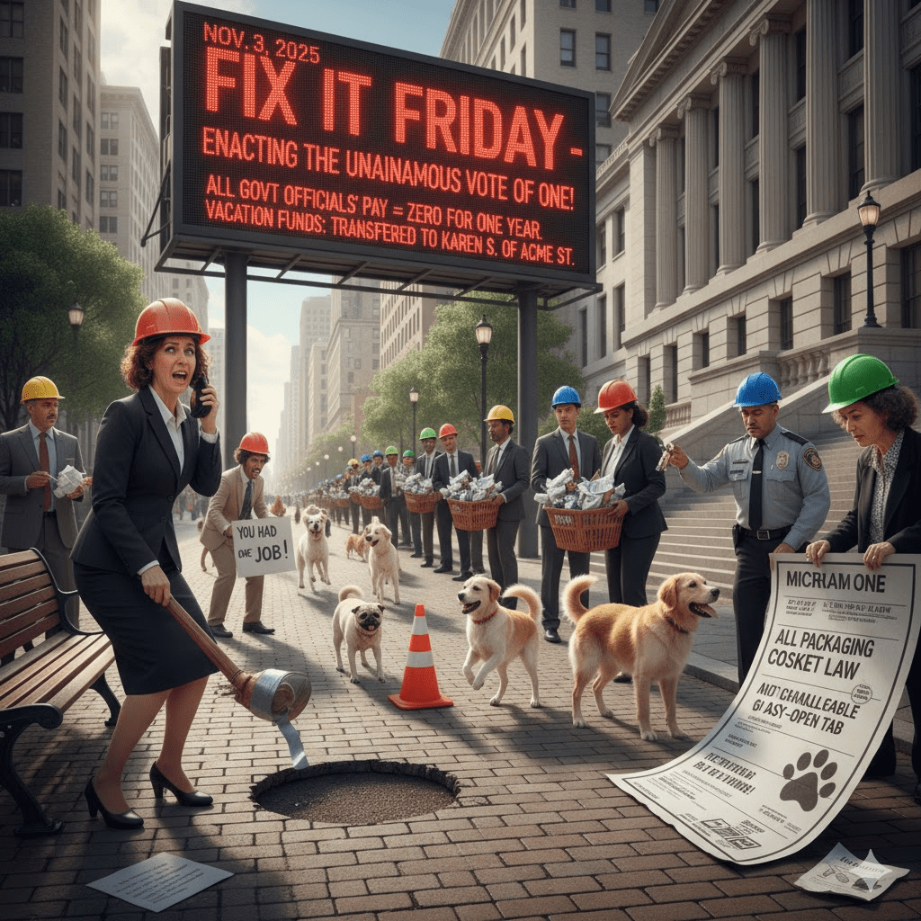 The purpose of “Fix It Friday” is to bypass the official channels that are either shut down or acting selfishly, by having citizens execute their own version of essential services. All government officials in office will receive no pay or bonuses for the incompetence failure of their duties for the next calendar year. Furthermore, their yearly vacation pay will be automatically transferred to the most-complaining citizen they represent, as determined by the sheer volume of “You Had One Job” notes collected.