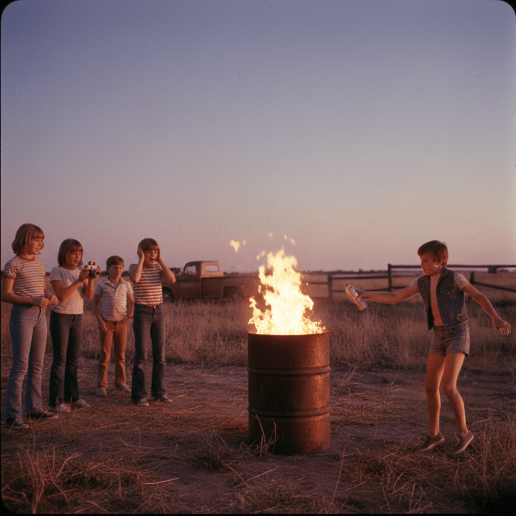 In my youth I grew up at the bottom Hillbilly Hill. it was in the center of a mid sized town and in a time when we could wander around town without worrying about much more than having fun. Yesterday thoughts of my childhood flooded in from the past and try as I might I couldn’t squish those memories. One in particular caused my friends to panic and take off over yonder from where I was standing. I was getting ready to show them a temerity by tossing a can of Aqua-net hairspray into a lit burning barrel. It was reckless only if someone walked by when it exploded.
