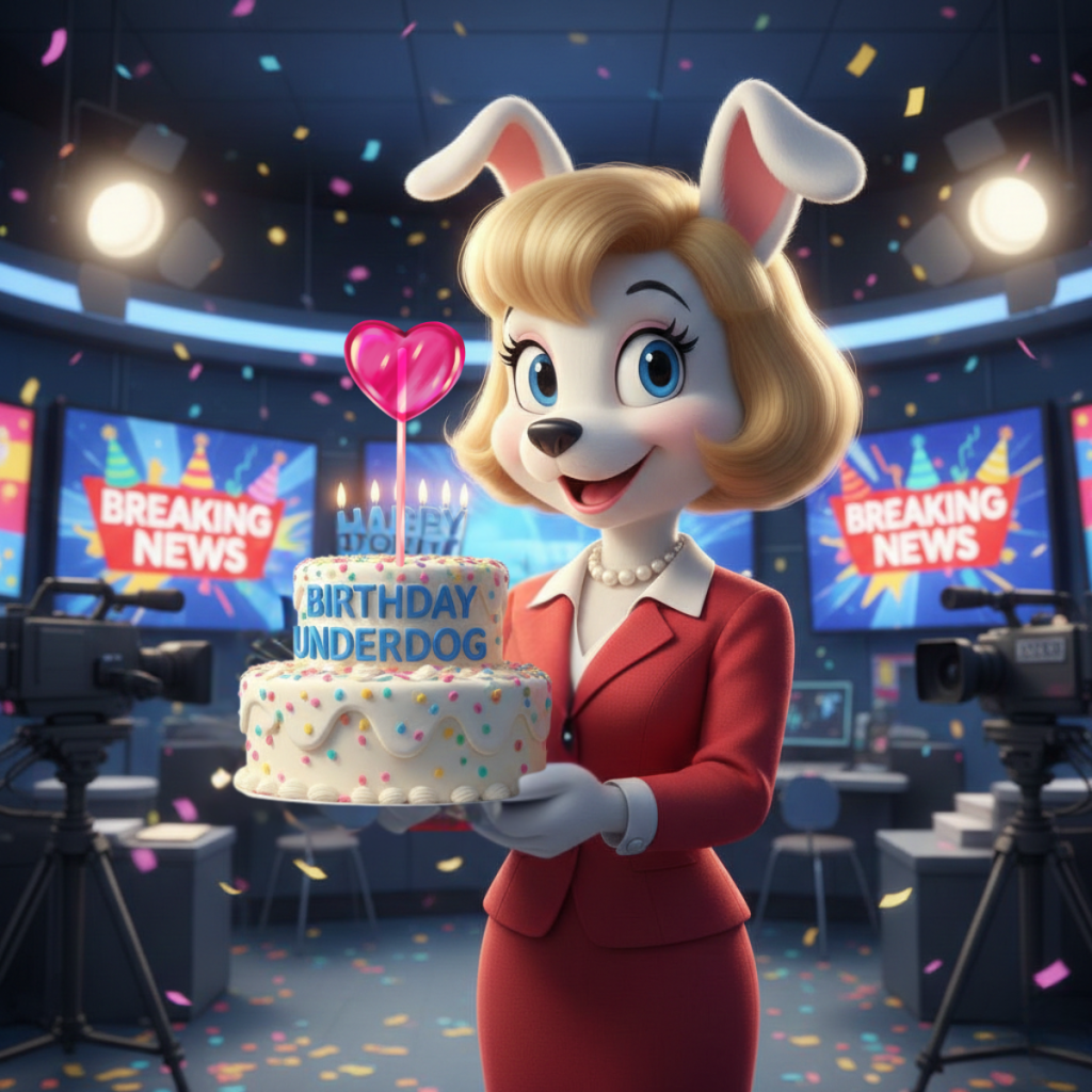The photograph was old and worn. It wasn’t worth any money but did have a unique hexagon phonebooth image. This would work good to copy off of and decorate the cake with. Sweet Polly Purebred, a television news reporter was excited for the opportunity of presenting a gift to her hero. She placed a giant lollipop in the center for Underdog, the love of her life. [66]